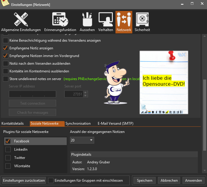 Im Trayicon-Kontextmenü rufen Sie die allgemeinen Programmeinstellungen auf. Aktivieren Sie hier den automatischen Start mit Windows, definieren einen Hotkey für neue Notizzettel, machen die Zettel ein wenig transparent oder ändern deren Aussehen durch das Wechseln des Skins. Sie können PNotes.NET anweisen, erst nach Eingabe eines Passworts zu starten, wenn Sie bspw. Ihr Tagebuch vor neugierigen Blicken schützen wollen. Das Programm bietet zudem eine Backupfunktion. Notizen lassen sich in Ihrem Heimnetzwerk und in soziale Netzwerke wie Facebook und Twitter verteilen. Außerdem ist ein Export nach Outlook möglich. In den Preferences in den "General Settings" können Sie auf deutsch umstellen. Dazu müssen Sie allerdings erst die Datei