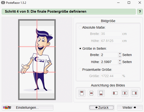 PosteRazor druckt auch mit einem normalen Drucker Bilder oder Dokumente in nicht limitierter Größe aus. Einzelne Bildausschnitte werden dabei bspw. auf DIN-A4 Blätter verteilt, ausgedruckt und anschließend von Ihnen zu einem Ganzen zusammengeklebt. In fünf Schritten führt PosteRazor von der Bildauswahl zu dem entsprechenden Ausdruck. Zunächst muss man das Bildmotiv laden. PosteRazor unterstützt dafür Formate wie z.B. BMP, GIF, ICO, JPEG, Kodak PhotoCD, PCX, PNG, PSD und TIFF. In der anschließenden Papierauswahl muss man sich für die Papiergröße entscheiden. Definieren Sie beim dritten Schritt einen Rand, der später als Klebefläche dient.
