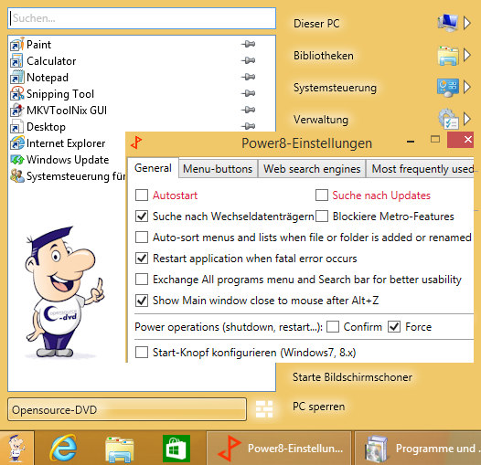 Den Standort der Suchfunktion und der Startmenü-Leiste vertauschen Sie in den Einstellungen mit "Exchange All programs menu ...". Per Suchfunktion lassen sich Begriffe direkt in bestimmten Suchdiensten finden. Mit b bzw. g opensource wird in Bing bzw. Google der Begriff opensource gesucht. Im Register "Web search engines" ändern Sie bei Bedarf die Vorgaben. Im Eingabefeld "All programs text..." ändert man den Namen der Startmenü-Leiste. Durch einen Klick auf den kleinen Button rechts von der Startmenü-Leiste gelangen Sie zu einer Übersicht der App-Kacheln! Der Startbutton kann durch ein anderes Bild (JPG, PNG, TIG oder GIF) ersetzt werden. Leider unterstützt das Programm noch kein Drag & Drop. Power8 überschreibt oder ändert keine Systemdateien. Damit Power8 nach jedem Systemstart aktiviert wird, müssen Sie in den Einstellungen ein Häkchen vor Autostart setzen.