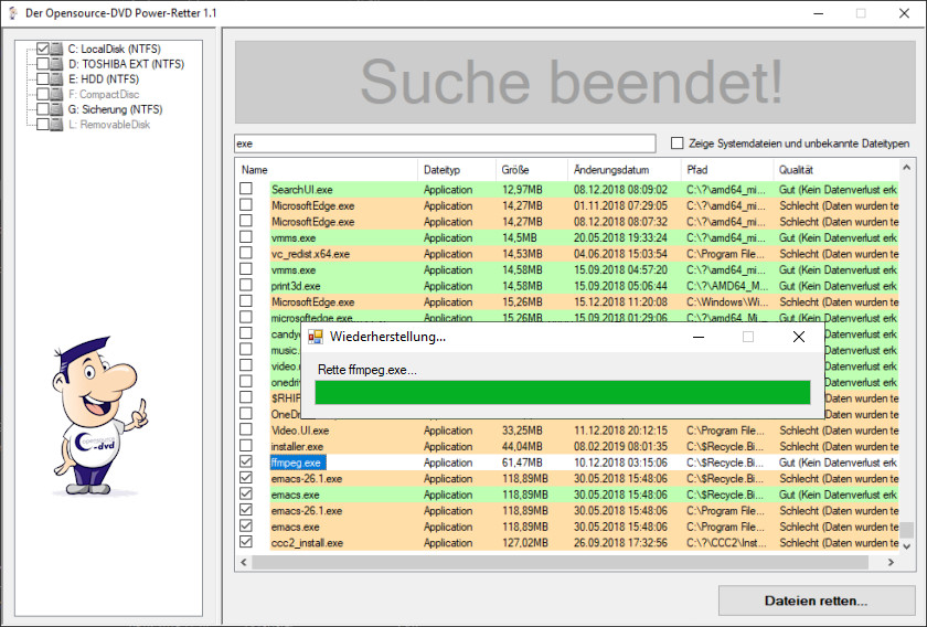 Schon passiert? Ein verkehrter Mausklick, und eine wichtige Datei scheint für immer verloren zu sein. Das Opensource-DVD Team stellt Ihnen mit Power-Retter ein Tool zur Verfügung, das für Sie in dieser Situation sozusagen die letzte Rettung sein kann. Für uns war es wichtig, Ihnen eine Programm-Oberfläche zu bieten, deren Bedienung keine zusätzliche Hilfedatei benötigt. Wählen Sie links das Speichermedium aus und klicken auf den Button "Suche starten!". Bei Bedarf können Sie zuvor noch "Systemdateien und unbekannte Dateitypen" aktivieren. Dann erscheinen in der Liste auch CAB-, DB-, DLL-, INI-, LNK-, LOG- und TMP-Dateien. Je nach Größe des Speichermediums kann es etwas dauern, bis Sie die Meldung "Suche beendet!" erhalten. Die Trefferliste lässt sich nach Dateinamen, -typ, -größe, -Änderungsdatum und -Pfad sortieren. Oder Sie lassen sich die gefundenen Dateien ganz oben anzeigen, die besonders gut erhalten geblieben sind (Qualität: Exzellent).