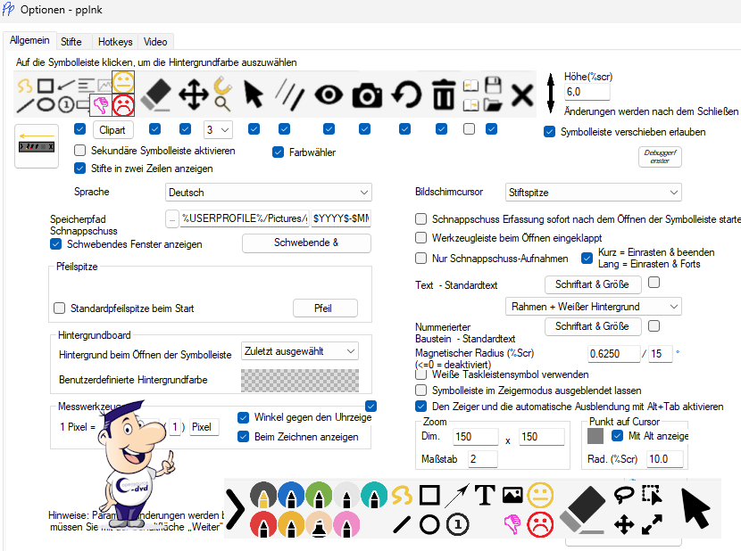 Im Gegensatz zum "Mülleimer", der alles löscht, lassen sich auch einzelne Markierungen verschieben, ausradieren oder zurücknehmen. Mit ppInk erstellte Zeichnungen können Sie ggf. mit dem Screenshot-Tool als Bild abspeichern. Durch einen Klick auf den Pfeil links wird die Leiste "zusammengerollt" und mit der ESC-Taste verschwindet sie vollständig. Es lohnt sich, die ppInk-Einstellungen über das Trayicon aufzurufen. Hier können Sie bis zu zehn Stifte nach Ihren Vorstellungen einrichten. Bestimmen Sie dabei deren Farbe, Dicke und Linienstil. Außerdem aktivieren Sie auf Wunsch die Video-Aufnahmefunktion, ändern bei Bedarf die ppInk-Tastenkombination und den Speicherpfad für die Screenshots. Auf der Homepage finden Sie zahlreiche weitere Tipps zu allen Funktionen.