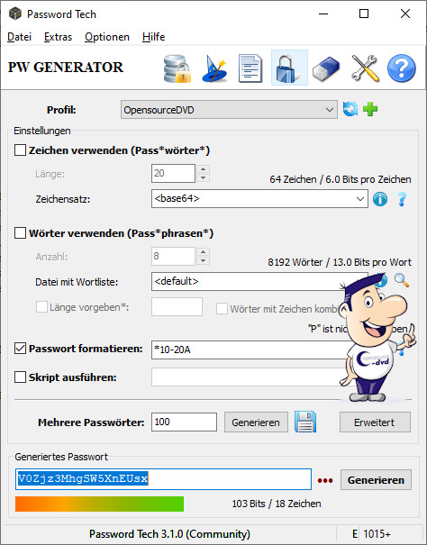 Die Zeit zwischen Ihren Aktionen wird gemessen und zur Erzeugung individueller Zufallswerte genutzt, aus denen sich dann die Zeichenfolge des Passworts ergibt. Nach dem Erzeugen des Passworts klicken Sie mit der rechten Maustaste auf dieses Feld und kopieren es, ggf. auch verschlüsselt, in die Zwischenablage oder speichern es in einer Textdatei. Die Zusammenstellung Ihrer Vorgaben kann als Profil gespeichert und schnell wieder aufgerufen werden. Es lassen sich in einem Schritt auch mehrere Passwörter generieren. Den integrierten Passwort-Manager zum Verwalten Ihrer Passwörter rufen Sie über den entsprechenden Button oder das Datei-Menü auf.