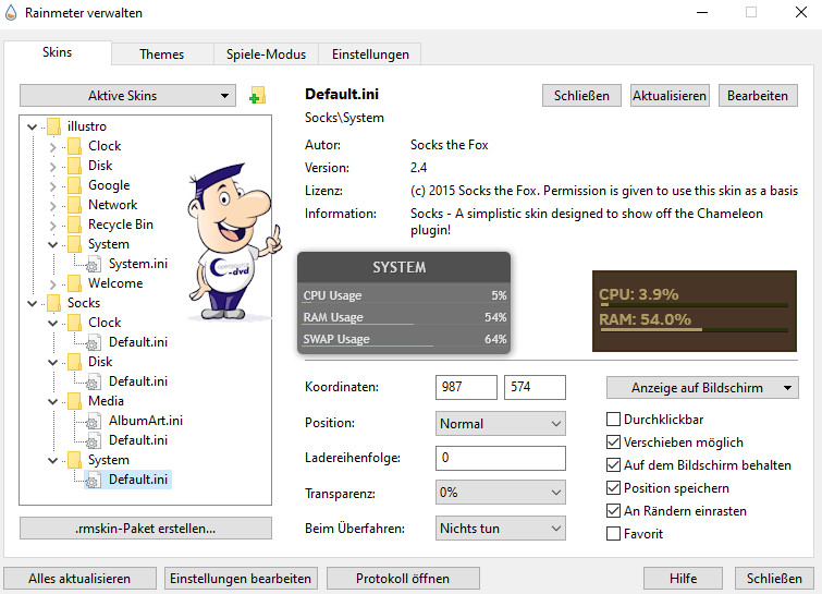 angeboten. Mit einem Klick auf das Trayicon rufen Sie ein Fenster auf, das zum Ändern und Verwalten der Rainmeter-Skins dient.