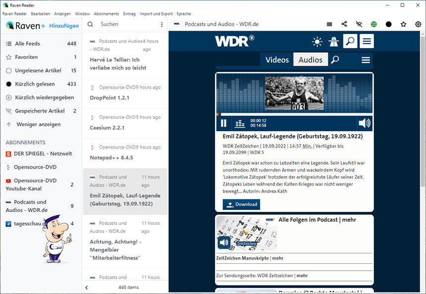 Der RSS-Newsreader hilft Ihnen dabei, in den Bereichen up to date zu bleiben, die Sie auch tatsächlich interessieren. Raven Reader verschafft Ihnen nicht nur Zugang zu RSS-Feeds, sondern auch zu Podcast-Episoden und YouTube-Videos. Die multimedialen Inhalte lassen sich direkt aus der Anwendung heraus abspielen. In dem dreispaltigen Layout Sidebar, Artikelliste, Artikel klicken Sie oben links auf "Hinzufügen", um einen RSS-Feed zu abonnieren. Mit der Importfunktion werden die Adressen in XML- oder OPML-Dateien ausgelesen und in die Liste integriert. Die abonnierten Adressen können Kategorien zugeordnet werden. Eine Kategorie wird über Einstellungen - "Kategorien verwalten" erstellt und mit einem Feed verknüpft. Weitere Feeds verschieben Sie in diese Kategorie über "Bearbeiten" im Bereich "Feeds verwalten".