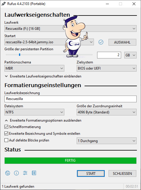 : Rufus muss den USB-Stick formatieren, um daraus einen bootbaren Datenträger zu machen - dabei werden alle vorhandenen Daten gelöscht! Platz, der nach der Übertragung des Abbildes auf dem Stick frei bleibt, kann wieder für andere Dateien verwendet werden.