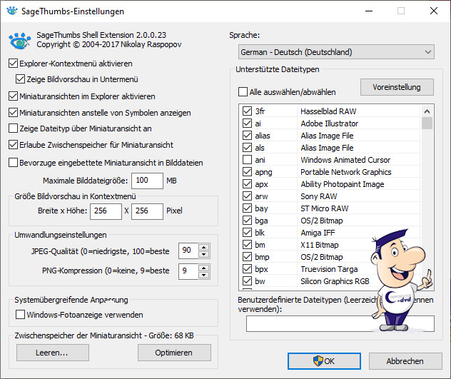 installieren. In den Einstellungen passen Sie Vorgaben für das Konvertieren nach JPG und PNG an und bestimmen ggf. Dateiformate, die für SageThumbs tabu sein sollen. Darstellungsprobleme lassen sich meist durch das Leeren des Zwischenspeichers für Miniaturansichten beheben.