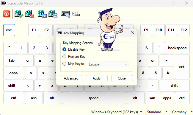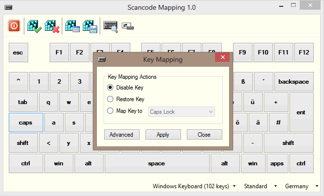 Haben Sie schon einmal das Bedürfnis verspürt, Ihre Tastaturbelegung zu ändern? Scancode Mapping macht es möglich. Mit geringem Aufwand deaktivieren Sie Tasten oder hinterlegen sie mit einem neuen Zeichen bzw. einer neuen Funktion. Zunächst gleichen Sie rechts unten die virtuelle Ihrer Tastatur an (Windows Keyboard - 102 keys, Germany). Angenommen, Sie möchten die Umschaltsperre (Feststelltaste, Caps Lock) deaktivieren, um künftig Endlosreihen von Großbuchstaben und Sonderzeichen zu vermeiden. Dazu markieren Sie die caps-Taste und klicken auf den Button "Change mapping for currently selected keyboard key". In dem neuen Fenster (Key Mapping) aktivieren Sie Disable und schließen es mit Apply und Close.