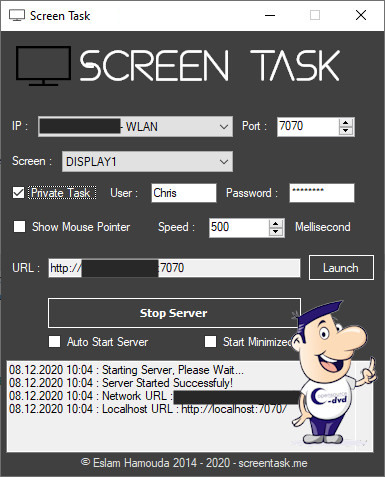 Mit ScreenTask ermöglichen Sie allen, die in Ihrem Netzwerk (WLAN und LAN) per Computer, Laptop, Tablet oder Smartphone eingebunden sind, sich den Desktop des Servers anzusehen. Dazu benötigt man keine Remotedesktopverbindung und keine Clientinstallation. Es genügt, auf dem Server ScreenTask zu installieren. Nach einem Klick auf "Start Server" wird eine Internetadresse (Url) generiert. Diese muss ein Benutzer in seinem Browser eingeben und schon erscheint bei ihm Ihr Desktop. Dadurch kann er in Echtzeit jede Aktion auf dem Server mitverfolgen.