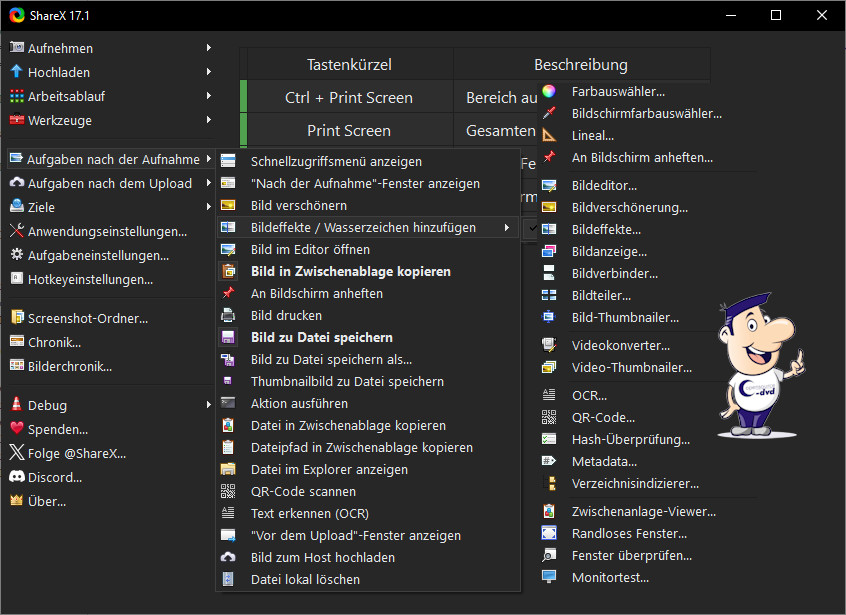 Abgespeichert wird es als MP4 oder animiertes GIF. ShareX besticht durch viele Zusatzprogramme (Werkzeuge) wie einen Farbwähler, Bildbearbeiter und -effekte, Video Thumbnailer (Screenshots aus Videos erstellen), Texterkennung (OCR), Videokonverter und Bildverbinder (Mehrere Bilder zu einem Bild verbinden). In den "Aufgabeneinstellungen" lassen sich Ordner bestimmen, die ShareX überwachen soll. Sobald Dateien in einen dieser Ordner kopiert werden, wird der entsprechende Standard-Hochlader aktiv. Unter Aufgabeneinstellungen - Bildschirmaufzeichner passen Sie die Qualitäts-Einstellungen für animierte GIFs bzw. MP4-Videos an. Im Bild-Bereich ändern Sie das Standardformat für Screenshots (BMP, PNG, GIF, JPG, TIF).