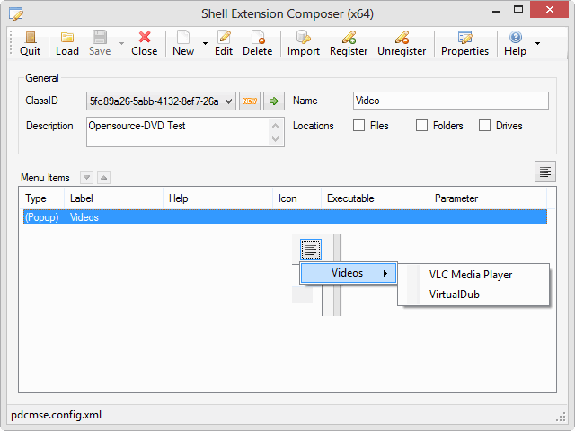 Mit einem Klick auf den Button "Test current menu" erhalten Sie eine Vorschau, wie es im Kontextmenü aussehen wird. Speichern Sie die neue Konfiguration ab und klicken auf Register, um die Daten in die Systemdateien (Registry) eintragen zu lassen. Ab sofort sehen Sie im Kontextmenü (rechte Maustaste) einer Datei das Popupmenü Videos mit seinen beiden Programmlinks. Dadurch können Sie nun auswählen, mit welchem Player ein Video abgespielt werden soll. Menüs und Verknüpfungen können Sie eigene Icons zuweisen und mit Linien bzw. Menüteilern (Separator) übersichtlicher gestalten. Nach dem Deaktivieren von "Multi Select" lässt sich ein Link nicht aufrufen, wenn mehrere Dateien markiert wurden. Im Locationsbereich geben Sie vor, ob auch die Ordner- und Laufwerks-Kontextmenüs Ihre Links anzeigen sollen. Einträge, die Sie mit Shell Extension Composer registriert haben, holen Sie mit Import in die Oberfläche zurück und können editiert oder gelöscht (Unregister) werden.