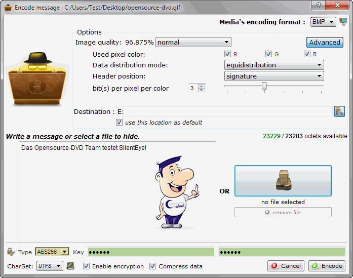 Nach einem Klick auf den Encode-Button öffnet sich ein weiteres Fenster. Die Angabe "octets available" zeigt Ihnen, welche Speichergröße für Ihre geheime Botschaft zur Verfügung steht. Zum Verschlüsseln setzen Sie ein Häkchen vor "Enable encryption", wählen zwischen der Schlüssellänge 128 oder 256 Bit und tragen ein Passwort in die beiden Key-Felder ein. Zum Entschlüsseln (Decode) benötigt der Empfänger das Programm SilentEye sowie das richtige Passwort.