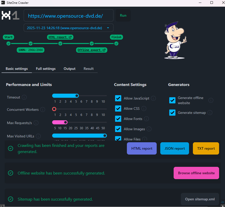 Der SiteOne Crawler macht es Ihnen sehr einfach, Internetseiten komplett mit Bildern, CSS, JavaScript und Schriftarten auf Ihre Festplatte zu kopieren. Dadurch, dass er die Dateistruktur der ausgewählten Website beibehält, können Sie offline so in den Seiten navigieren, als ob Sie online wären. Sinnvoll sind Website-Backups bspw. für rechtliche oder archivarische Zwecke, dem Vorbereiten von Demos, die ohne Internet funktionieren sollen, das Einrichten von Disaster-Recovery-Systemen (DR-Systeme) sowie das Erstellen statischer Versionen dynamischer Websites. Oben geben Sie die Internetadresse der Website ein und starten mit einem Klick auf "Run". Je nach Größe des Projekts kann es etwas dauern, bis die Ergebnisse (Result) erscheinen. Danach können Sie den Report als HTML-, Text- oder JSON-Datei anzeigen lassen. Unter "Manually browsing the output" wird der Ordner angezeigt, in dem alle Ergebnisse gespeichert wurden. Dort finden Sie auch die sitemap.xml, die der Crawler automatisch erstellt (Generate sitemap).