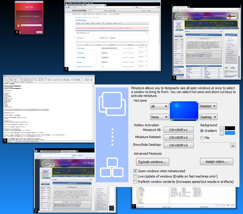 SmallWindows legt alle Programmfenster nebeneinander auf Ihren Desktop. Bereits minimierte Fenster werden nicht berücksichtigt. Die jeweilige Fenstergröße wird automatisch an Ihre Bildschirmauflösung angepasst. Ein Fenster wird ein wenig vergrößert, sobald Sie es mit dem Mauszeiger bzw. mit den Pfeiltasten anwählen. Ein Klick der linken Maustaste auf das Fenster oder das Drücken der Zahl, die einem Fenster zugewiesen wurde, holt es nach dem Wechsel in die normale Ansicht in den Vordergrund. SmallWindows kann auch alle Fenster an den Monitor-Rand minimieren, damit Sie freie Sicht auf den Desktop haben.