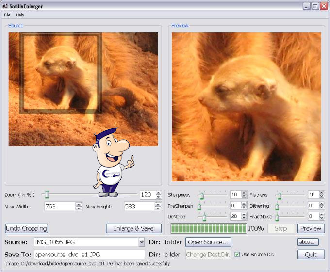 SmillaEnlarger vergrößert Ausschnitte Ihrer Digitalfotos ohne störende Treppeneffekte. Mit "Open Source" laden Sie ein Bild. Ein Rechteck zeigt den Bereich an, der vergrößert wird. Mit gedrückter linker Maustaste ziehen Sie eine neue Markierung auf. Zum Verschieben des Rechtecks klicken Sie auf dessen Rahmen und ziehen ihn an die gewünschte Stelle. Die Ausschnittgröße verändern Sie mit dem Zoomregler.