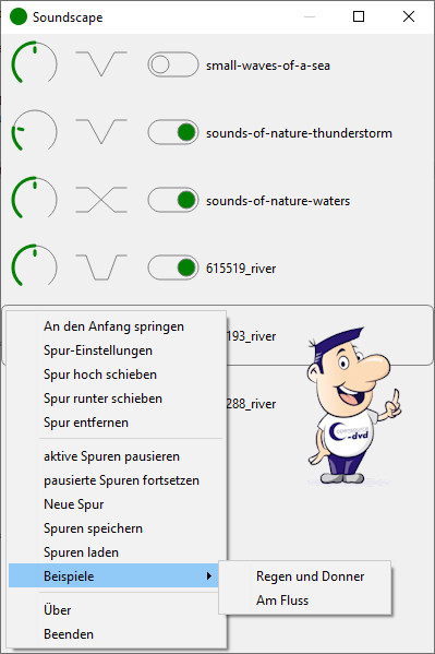 Manche fühlen sich bei Ihren Beschäftigungen durch Hintergrundgeräusche gestört, andere hingegen empfinden sie als angenehm. Letztere werden an Soundscape Ihre Freude haben. Es mischt neutrale, beruhigende Soundeffekte und verzichtet auf Gesang, der nur ablenken würde. Zu den Funktionen gelangt man mit einem Rechtsklick auf das Programmfenster. Im Beipiele-Menü sind bereits "Regen und Donner" und "Am Fluss" vorinstalliert.