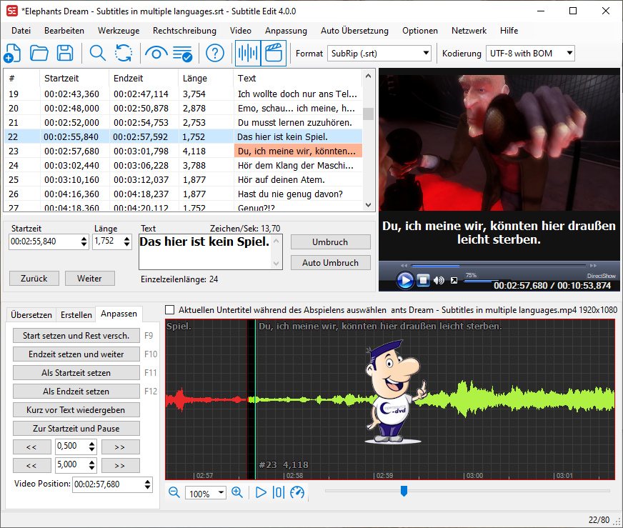Subtitle Edit ist ein empfehlenswertes Programm zum Erstellen und Bearbeiten von Film-Untertiteln. Es ist imstande, Grafikuntertitel einer DVD oder Blu-ray auszulesen und zu editieren sowie unzählige Dateiformate wie SRT, SSA, ASS, SIF, TTS und XML zu öffnen und abzuspeichern. Ein Anwendungsbeispiel: Sie wollen deutsche Untertitel zum Video "Elephants Dream" bearbeiten. Zuerst downloaden Sie mit