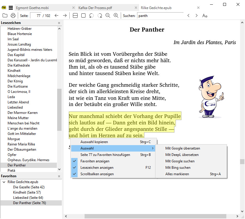 SumatraPDF ist darauf spezialisiert, das Öffnen und Drucken von PDF-Dateien erheblich zu beschleunigen. Dadurch muss man zwar auf manche Funktionen verzichten, die aber wirklich wichtigen sind vorhanden. Dazu gehört die Zoomfunktion, die Anzeige von Lesezeichen, das Setzen einer Seite als Favorit, Inhalte kopieren, Texte suchen und das direkte Anspringen einer Seite. Neben PDF beherrscht das Programm auch Formate wie CHM, XPS, CBZ/CBR (Comic-Book), EPUB, MOBI, FB2 (FictionBook) und DJVU. Ist