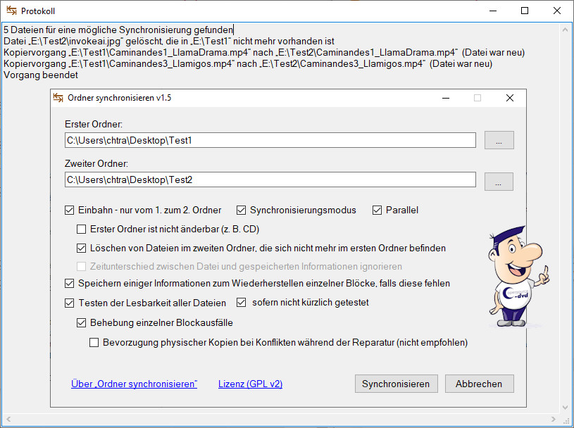 Zudem können Sie vorgeben, dass SyncFolders Dateien im zweiten Ordner löscht, die sich nicht mehr im ersten befinden. Ist "Einbahn" nicht aktiviert, wird in beide Richtungen abgeglichen. Mit "Parallel" werden die Dateien gleichzeitig, nicht nacheinander kopiert. Aus Sicherheitsgründen ist die Funktion "Speichern einiger Informationen zum Wiederherstellen..." zu empfehlen. Das Programm legt dann jeweils den Unterordner RestoreInfo an, in dem es CHK-Dateien speichert, die ggf. zur Wiederherstellung der Originale verwendet werden können. Die Logdateien, in denen SyncFolders alle Aktionen protokolliert, finden Sie im Dokumenten-Ordner. Ein automatischer Abgleich der Ordner ist noch nicht möglich.