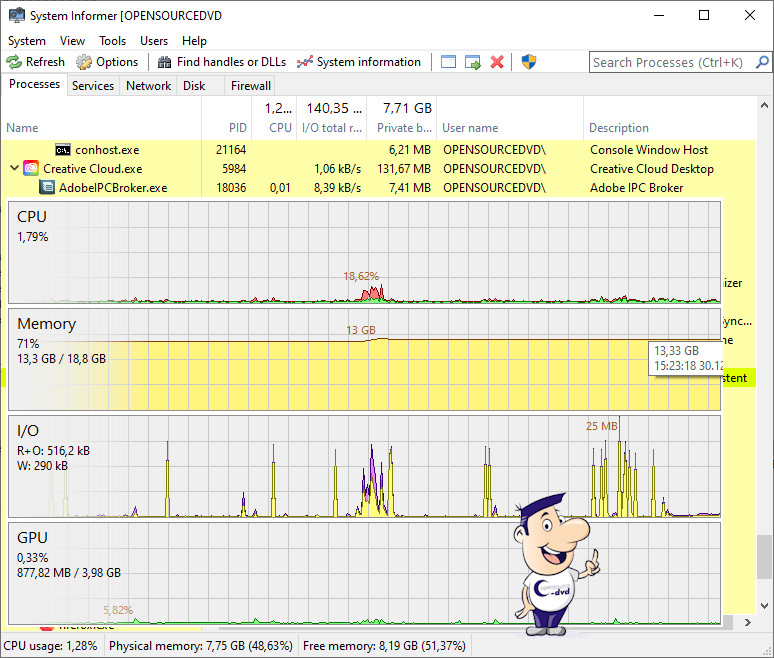 Mit dem System Informer analysieren, verwalten und überwachen Sie Prozesse und Systemdienste. Mit einem Doppelklick auf einen Eintrag in der Prozessliste (Processes) öffnen Sie die Taskeigenschaften (Properties). Erfahren Sie dadurch, welche Module der Prozess nutzt und ob er mit einem Systemdienst verknüpft ist. Über das Kontextmenü (rechte Maustaste) lassen sich Prozesse und Dienste beenden oder neu starten. Mit der Funktion "Run As..." (Miscellanous) können Sie ein Programm als nicht angemeldeter Benutzer ausführen. Sie ersparen sich somit den Benutzerwechsel.