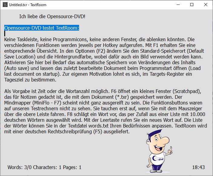 Als Vorgabe ist Zeit oder die Wortanzahl möglich. F6 öffnet ein kleines Fenster (Scratchpad), das für Notizen gedacht ist, die mit dem Dokument (*.txr) gespeichert werden. Der Mindmapper (MiniFlo - F7) scheint nicht ganz ausgereift zu sein. Die Funktionsbuttons waren auf unseren Testrechnern nicht zu sehen. Sie tauchen erst auf, wenn Sie mit dem Mauszeiger über die obere Leiste fahren. F8 schlägt ein Wort vor, das per Zufall aus einer Liste mit 10.000 deutschen Wörtern ausgewählt wird. Mit der Leertaste rufen Sie ein neues Wort auf. Die Liste der Wörter können Sie in der Textdatei words.txt Ihren Bedürfnissen anpassen. TextRoom wird mit einer deutschen Rechtschreibprüfung (F5) ausgeliefert.