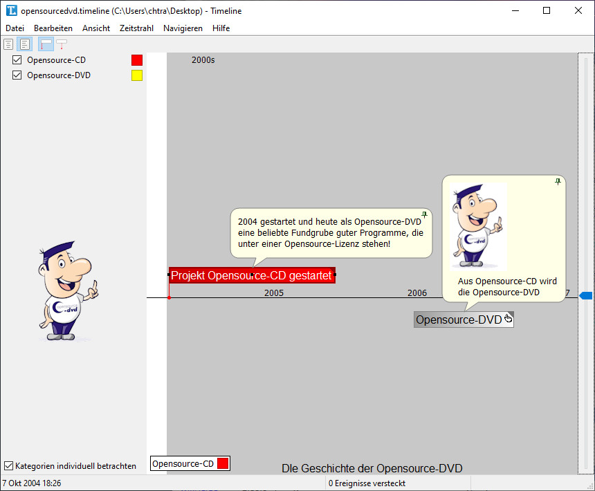 Ebenso "Sichern und Duplizieren", womit Sie wiederkehrende Termine einrichten. Der Zeitstrahl lässt sich mit einer Epoche wie 18. Jahrhundert hinterlegen (Zeitstrahl - Epochen bearbeiten). Ihre Zusatzbemerkungen erscheinen, sobald Sie mit der Maus auf den Banner "Johann Wolfgang von Goethe" zeigen. Mit "Haftende Blase" in dessen Kontextmenü bleiben sie permanent sichtbar. Die Größe des Ereignis-Banners und damit auch des Textinhalts ändert man mit ALT/+ bzw. ALT/-. Mit STRG/+ oder STRG/- ziehen Sie die Ansicht der Zeitlinie auseinander bzw. zusammen. Im linken Bereich des Programmfensters werden Ihre Kategorien aufgelistet, über die Sie schnell ein zugehöriges Ereignis ein- bzw. ausblenden. Ihren Zeitstrahl können Sie auf schreibgeschützt einstellen (Zeitstrahl - Nur lesbar). Über Datei und "Ereignisse importieren" lassen sich Daten aus ICS-Dateien übernehmen, dem Kalender-Austauschformat iCalendar. Für den Export eines Zeitstrahls stehen CSV und die Bildformate SVG und PNG zur Auswahl.