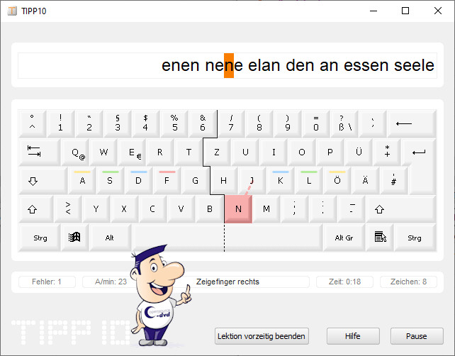 Oben werden die Buchstaben angezeigt, die Sie anschlagen müssen. Die Geschwindigkeit der Laufschrift bestimmen Sie über Datei - Grundeinstellungen. Die jeweilige Taste wird auf der virtuellen Tastatur farbig markiert. Als weitere Hilfestellung weist Sie eine Textzeile darauf hin, welchen Finger Sie verwenden müssen. Als Reaktion auf Tippfehler können Sie "Fehler korrigieren" wählen. Diese Funktion erfordert es, dass Sie nach einem Fehler die richtige Taste bedienen müssen. Am Ende einer Lektion erhalten Sie eine ausführliche Auswertung.