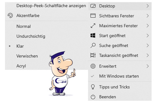 TranslucentTB überträgt das "Fluent Design" von Microsoft auf die Taskleiste. Dadurch ist es möglich, dass sie leicht verschwommen oder völlig durchscheinend wird. Gesteuert wird das Tool über das Kontextmenü, das Sie mit einem Mausklick auf das Trayicon in der Infobar aufrufen. Neben "Verwischen" und "Klar" können Sie auch völlig undurchsichtig oder Acryl auswählen. Mit "Akzentfarbe" bestimmen Sie im Undurchsichtig- oder Acryl-Modus eine Farbe, die betont werden soll.