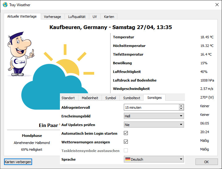 Tray Weather bietet schnellen Zugriff auf aktuelle Wetterdaten. Sie selbst bestimmen, ob es die Daten Ihres Standortes oder bspw. Ihres nächsten Urlaubsorts sein sollen. Sobald Sie den Mauszeiger über das Taskleistensymbol bewegen, erscheinen die aktuelle Temperatur- und Wetterbeschreibung. Zu weiteren Informationen gelangen Sie mit einem Doppelklick. Angezeigt werden Temperatur, Luftdruck, -feuchtigkeit und -qualität, Windgeschwindigkeit, die Zeiten für Sonnenuntergang und -aufgang und mehr. In den weiteren Registern erhalten Sie den UV-Index (nur über OpenMeteo, den Sie dazu im Anbieter-Register auswählen) sowie Wetter- und Luftqualitäts-Vorhersagen für die nächsten fünf Tage. Auf einer Wetterkarte werden entsprechend Ihrer Vorgabe die lokale Temperatur, Regenentwicklung, Wolkendecke und Windgeschwindigkeit angezeigt.