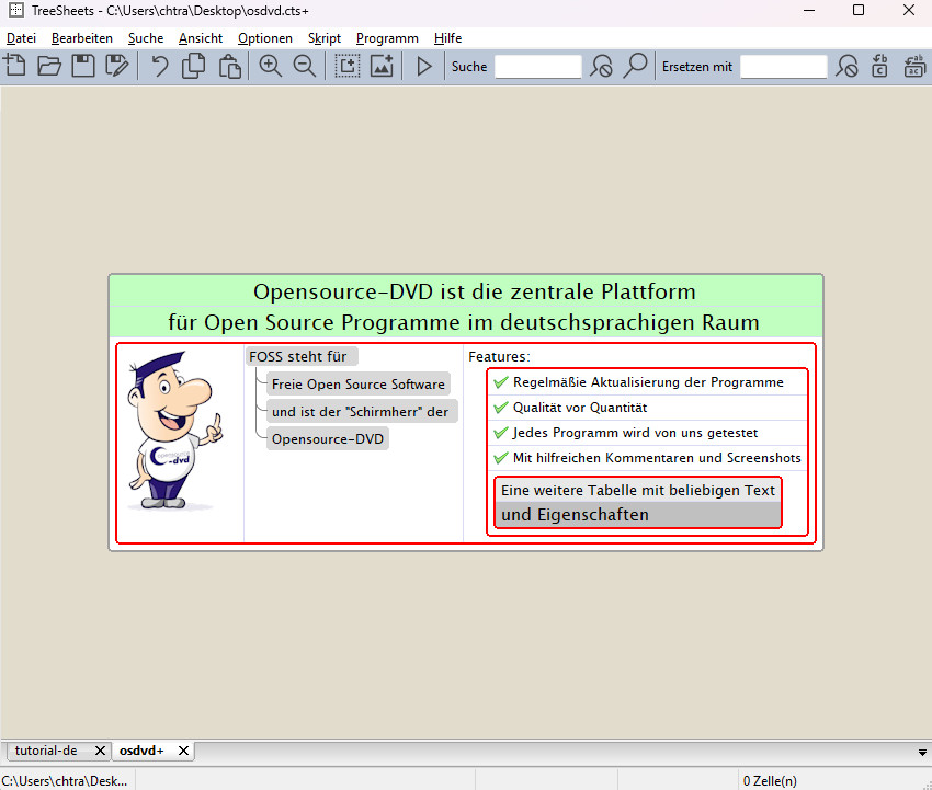 TreeSheets könnte man als eine Mischung aus Desktop-Publishing-Software (DTP) und Tabellenkalkulation beschreiben. Die Felder (Zellen), Zeilen und Spalten bieten mannigfaltige Möglichkeiten zum Kombinieren von Bildern und Texten. Dadurch eignet es sich für To-Do-Listen, Projektmanagement, Brainstorming, Präsentation von Informationen und vieles mehr. Zugegeben, es braucht vielleicht ein wenig Einarbeitungszeit, um die Stärken des Programms voll ausschöpfen zu können. Sehr zu empfehlen ist daher das Durchlesen der Einführung (Tutorial), die beim Programmstart automatisch geöffnet wird. Die
