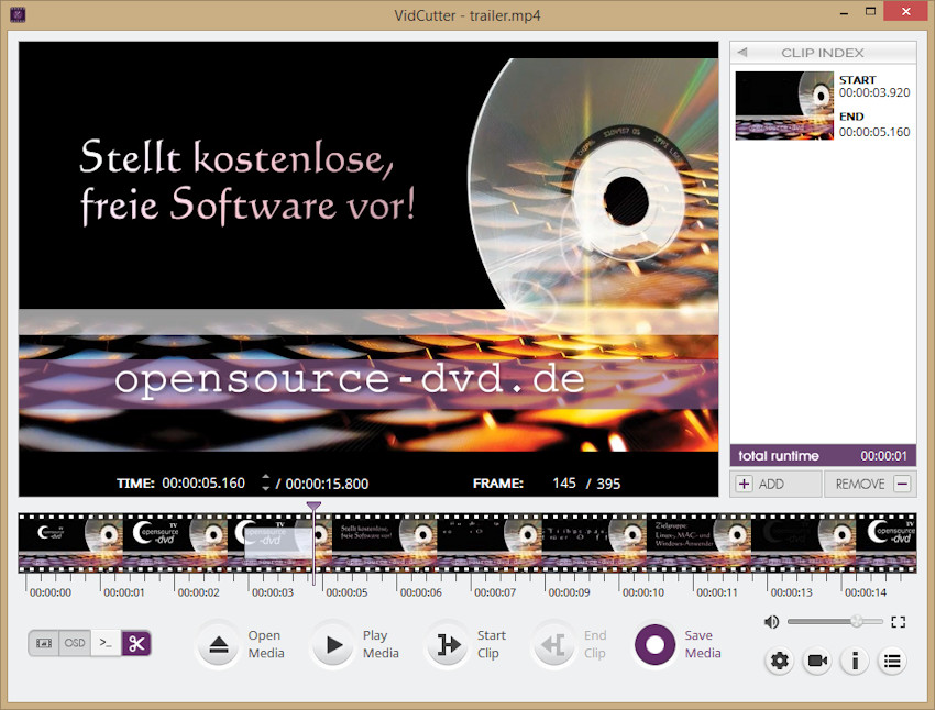 Mit VidCutter wird es jedem leichtfallen, seine Videos zuzuschneiden. Das Programm unterstützt alle gängigen Videoformate. Ein Video wird per Drag & Drop oder "Open Media" eingebunden. Das Ausschneiden nehmen Sie über die Zeitleiste oder die Time-Anzeige vor. Die Werte bzw. die Regler-Position werden per Maus oder Tastatur geändert. Sobald der Regler sich am Anfang des Ausschnitts befindet, klicken Sie auf "Start Clip". Danach wird der Regler zum Ende des Ausschnitts verschoben.