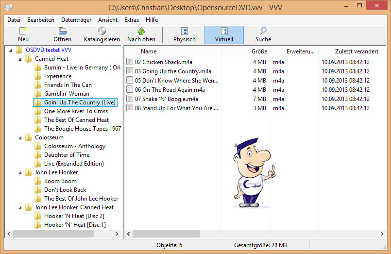 VVV, Virtual Volumes View, erleichtert Ihnen das Auffinden bestimmter Dateien, die sich auf einer CD/DVD oder anderen Medien befinden. Dazu werden die Strukturen aller Dateien eines Ordners und Unterordners bzw. Laufwerks in Katalogen archiviert. Nach Klicks auf die Buttons Neu und dann Katalogisieren bestimmen Sie ein Laufwerk oder ein Verzeichnis und tragen einen passenden Datenträgernamen ein. Nach dem Einlesen des Mediums wird die vollständige Ordner- und Dateistruktur unter dem Datenträger- bzw. Katalognamen angezeigt, hier "Physikalische Ansicht" genannt. Diese mag aber je nach Ordnerstruktur sehr unübersichtlich sein. Hier kommt die "Virtuelle Ansicht" ins Spiel. Sie können darin beliebig viele verschiedene virtuelle Verzeichnisse anlegen und in diese einzelne Dateien oder Ordner aus der "Physikalischen Ansicht" integrieren. Rein physikalisch ändert sich nichts, aber Sie verschaffen sich dadurch einen wesentlich besseren Überblick.