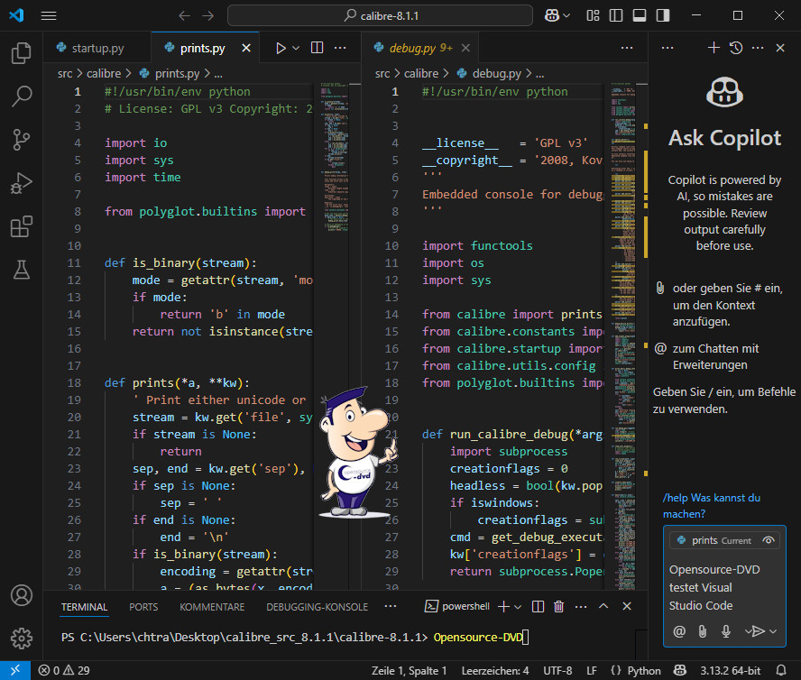 Das integrierte "IntelliSense" schlägt beim Bearbeiten eines Codes Vervollständigungen einer Eingabe vor, die man auswählen kann und die ggf. so manche Tipparbeit erspart. Zur deutschsprachigen Oberfläche wechseln Sie über View - Extensions, geben im Suchfeld german ein und klicken auf "German Language Pack for Visual Studio Code". Darunter klicken Sie auf "Install" und dann rechts unten auf "Change Language and Restart". Sie sind stolzer Besitzer eines GitHub-Kontos? Dann können Sie den KI-gestützten Programmierassistent "GitHub Copilot Free" direkt in Visual Studio Code nutzen. Viele Erweiterungen werden auf dem