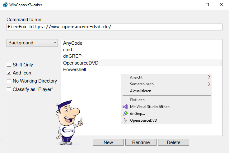 WinContextTweaker bietet eine bequeme Möglichkeit, das Rechtsklick-Menü ganz nach Belieben anzupassen. Die Elemente lassen sich hinzufügen, bearbeiten oder auch löschen. Das Programmfenster zeigt die bereits vorhandenen Einträge der Kontextmenüs an. Dabei können Sie Ihre Befehle dem Desktop (Background), den Verzeichnissen oder Dateitypen wie Bild-, Video, Textdateien gezielt zuordnen. Mit "Shift only" wird ein Eintrag nur bei Shift/Rechtsklick angezeigt. "Classify as Player" umgeht das Limit von 15 Markierungen.