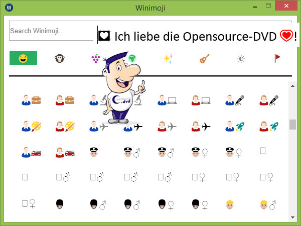 Ähnlich wie bei Whatsapp bietet Ihnen Winimoji ein Fenster prall gefüllt mit Emojis, die mit einem Mausklick in die Zwischenablage kopiert werden. Jetzt können Sie es in ein beliebiges Programm wie den LibreOffice Writer einfügen. Es ist vorteilhaft, dass die Bildschriftzeichen wie ein Teil der eingestellten Schriftart im Writer zu behandeln sind. Daher lassen sich Größe und Farbe wie bei einem normalen Buchstaben ändern. Sogar Fett, Kursiv und Unterstrichen lassen sich auf die Emojis anwenden.