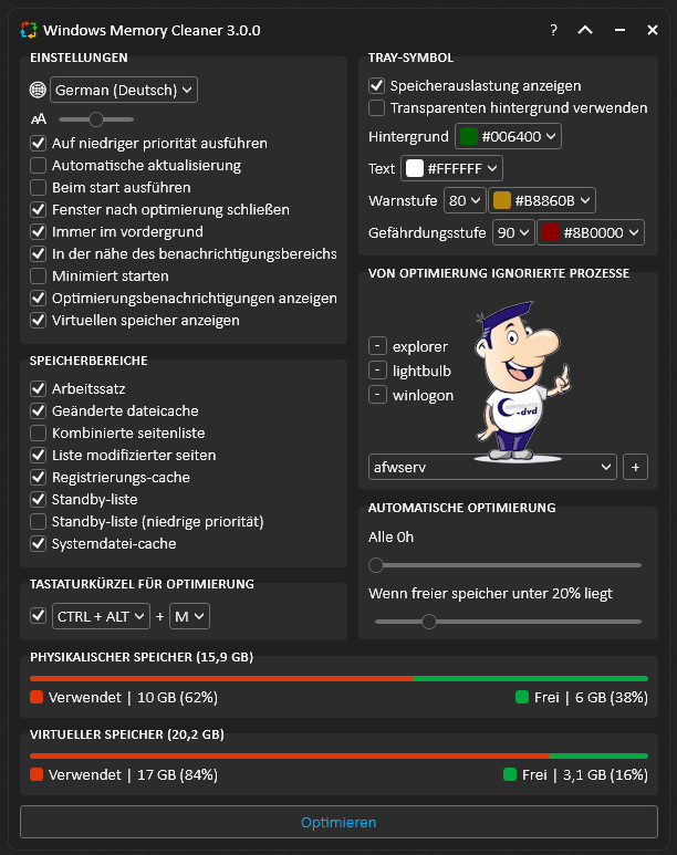 Nicht jeder verfügt über 16 oder mehr Gigabyte Arbeitsspeicher. Wer weniger hat, muss unter Umständen ein langsameres Arbeitstempo in Kauf nehmen. Abhilfe verschafft ggf. Windows Memory Cleaner. Durch einen Mausklick entfernt es aus dem Arbeitsspeicher Dateien, die im laufenden Betrieb nicht benötigt werden. Das Programmfenster informiert über die aktuelle Belegung des physikalischen Speichers und der Auslagerungsdatei ("Virtuellen Speicher anzeigen"). Sobald Sie das Fenster minimieren, zeigt das Trayicon die RAM-Auslastung an. Ist die Prozentzahl sehr hoch, kann ein Klick auf "Optimieren" bzw. die Tastenkombination STRG/ALT/M den Wert erheblich senken.