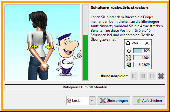 Verbringen Sie viel Zeit vor einem Computerbildschirm? Müssen Sie daher immer häufiger über zu sehr beanspruchte Augen sowie Nacken- und Rückenschmerzen klagen? Oder plagt Sie der sog. "Mausarm"? Mit Workrave können Sie ggf. solche Erkrankungen vermeiden bzw. bereits aufgetretene Symptome lindern. Dazu erinnert Sie das Tool daran, regelmäßig Pausen einzulegen und vorgeschlagene Leibesübungen nachzumachen. Es gibt drei Pausenarten. Die Mikropausen ermuntern Sie, Ihre Computerarbeit nach relativ kurzen Abständen für wenige Sekunden zu unterbrechen, um bspw. Ihre Augen zu entlasten. Die Ruhepause ist länger und schafft Raum für Gymnastik.