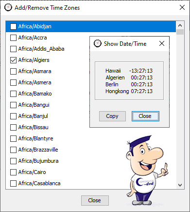 Eine Weltzeituhr, die Ihnen Datum und Uhrzeit beliebiger Zeitzonen anzeigt. Zuerst müssen Sie im Kontextmenü des Trayicons Zeitzonen hinzufügen (Add Time Zones). Es öffnet sich ein Fenster mit einer Liste aller Zeitzonen, die zur Verfügung stehen. Auf zweierlei Weise gelangen Sie zur Zeitanzeige. Sie richten Ihren Mauszeiger auf das Trayicon (Show Times in Tool Tip) oder gehen im Kontextmenü zu Show Date/Time.