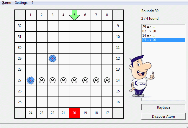Atomicresearch erinnert ein wenig an das populäre Spiel "Schiffe versenken". Allerdings müssen Sie sich keinem Gegner stellen und statt Schiffe gilt es, Atome aufzufinden. Ihr Ziel ist es, alle Atome mit möglichst wenigen Fehlversuchen aufzudecken. Zunächst wählen Sie die Anzahl der Felder und der verborgenen Atome. Im Modus "Discover Atom" könnten Sie jetzt jedes Feld anklicken und darauf hoffen, durch Zufall die Atome schnell zu finden. Das wäre jedoch eher langweilig und meistens würden Sie sich dadurch sehr viele "Strafpunkte" (Rounds) holen. Jedes traurige Smiley, das auf einen Fehlversuch folgt, ergibt 5 Strafpunkte. Nur einen Strafpunkt erhalten Sie beim "Beschießen" einer Linie. Wie funktioniert das? Wechseln Sie in den Raytrace-Modus. Klicken Sie nun mit der Maus auf eine Zeilen- bzw. Spaltennummer. Farbliche Hinweise zeigen, welchen Verlauf der Strahl genommen hat.