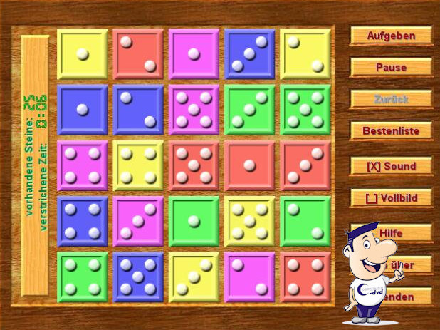 Dieses Strategiespiel setzt Ihnen die Aufgabe, wenn möglich bis auf einen Spielstein alle abzuräumen. Hierzu ziehen Sie die Spielsteine waagerecht oder senkrecht auf einen Stein derselben Farbe oder derselben Augenzahl. Es erfordert aber sehr viel Übung, um das ganze Spielfeld abzuräumen. Sie können allerdings jederzeit Züge zurücknehmen und neue Wege ausprobieren. Doch behalten Sie die Uhr im Auge.
