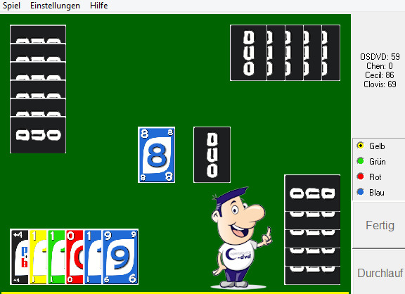 Zum Start des Spiels müssen Sie die Anzahl der Spieler (2 bis 4) und der Karten (3-15) festlegen und mit einem Klick auf den Fertig-Button anzeigen, dass es beginnen kann. Die meisten werden das Spielprinzip kennen. Die Karten bestehen aus Zahlen in vier verschiedenen Farben. Die ausgelegte Karte muss mit der passenden Zahl oder der entsprechenden Farbe bedient werden, es sei denn, Sie haben einen Joker. Wenn Sie diesen auslegen, können Sie die Farbe selbst wählen.