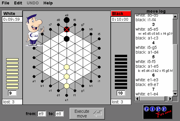 Zunächst wählen Sie für ein neues Spiel die Basis- oder Standardvariante mit jeweils 15 Spielsteinen pro Spieler oder die Turniervariante mit je 18 Spielsteinen. Es können zwei Personen gegeneinander oder eine Person gegen den Computer spielen. Ein Spiel zu beobachten, das der Computer gegen sich selbst führt, könnte Ihre Spielstärke verbessern. Mit "Timed game" spielen Sie auf Zeit. Für jeden stehen dann bis zu 120 Minuten zur Verfügung. Die Anzahl der verlorenen Steine wird im Lostfeld angezeigt. Jedes Spiel lässt sich speichern und später fortsetzen. Unter File - Setup verändern Sie die Spielstärke des Computers.