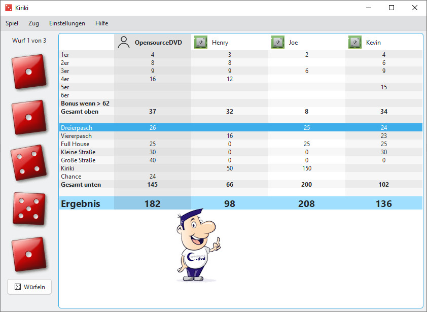 Im oberen Block werden jeweils gleiche Würfelwerte verzeichnet. Wenn man beim Sammeln in der Summe mindestens 63 Punkte bekommen hat, gibt es einen Bonus von 35 Punkten. Sobald es keine leeren Felder mehr gibt, werden die Punkte zusammengezählt. Gewinnen Sie ein Spiel, werden Sie mit einem Eintrag in die Bestenliste belohnt. Kiriki bietet auf Wunsch Zug-Tipps, wodurch Sie jedoch die Möglichkeit eines Eintrags in die Bestenliste verwirken. In den Einstellungen bestimmen Sie die Anzahl der Spieler von zwei bis sechs, ändern ggf. deren Namen und geben für jeden vor, ob es sich um einen Menschen oder das Programm handeln soll.