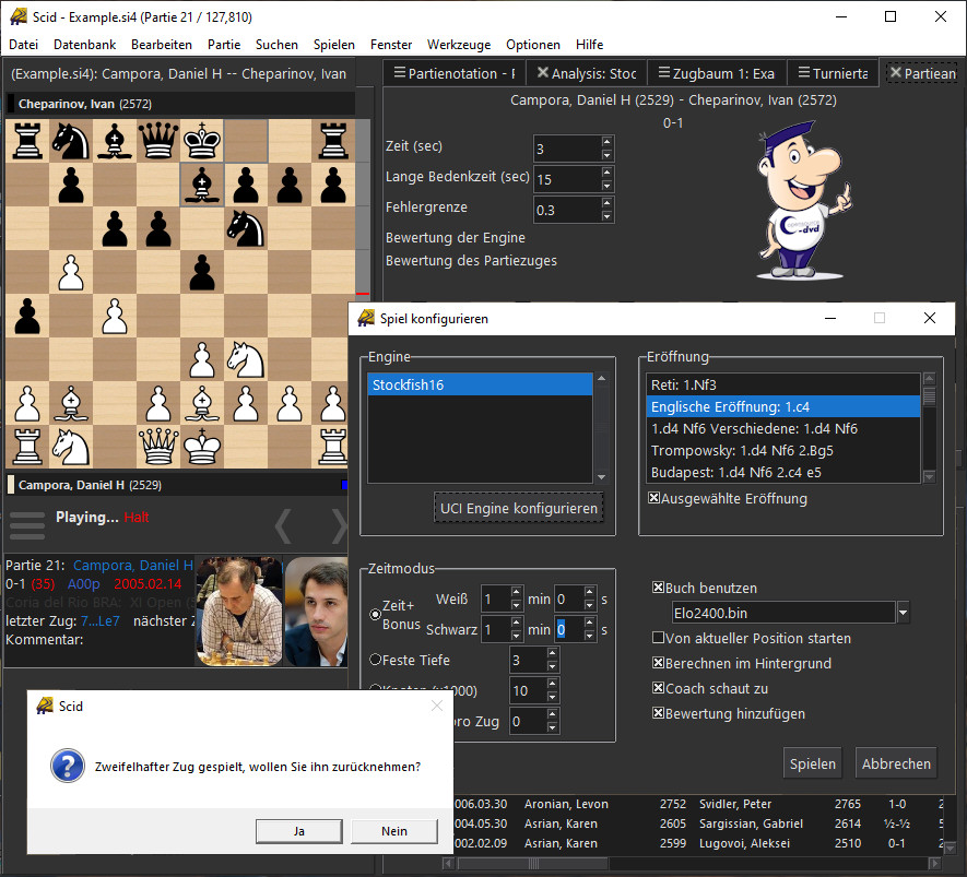 Aktivieren Sie bei einem "Ernsten Spiel" "Coach schaut zu", werden Sie ggf. auf schlechte oder zweifelhafte Züge hingewiesen und können den Zug zurücknehmen. Fernschach oder die Nutzung von FICS (Free Internet Chess Server) erlauben Onlinepartien. Eine Beispieldatenbank, die einige Partien von Großmeistern enthält, wird mitgeliefert. Weitere Datenbanken legen Sie durch den Import von Partien an, die im PGN-Format gespeichert wurden. Zu den Datenbankfunktionen gehören ein Verschiebungsbaum mit Statistiken, Spielerinformationen und Fotos sowie die Suche nach bestimmten Endungen, Positionen oder Spielern. Scid richtet sich an den fortgeschrittenen Schachspieler, für den Anfänger ist
