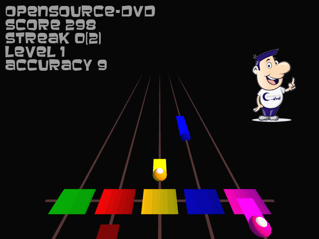 Bei Strings on Speed ist es Ihre Aufgabe, die Noten eines Liedes auf der Tastatur nachzuspielen. Die Töne rasen Ihnen als Kugel auf den entsprechenden Gitarrensaiten entgegen. Wie treffen Sie nun den richtigen Ton? Rauscht bspw. auf der ersten Saite ein Ton heran, dann heben Sie mit der F1-Taste rechtzeitig den ersten Bund an und drücken zusätzlich die ENTER-Taste, sobald die Kugel Ihren Bund erreicht hat. Jeder getroffene Ton wird mit Punkten belohnt. Je nach Schwierigkeitsgrad kann Ihr Reaktionsvermögen durchaus auf eine harte Probe gestellt werden. Für die anderen vier Saiten verwenden Sie die Tasten F2-F5.