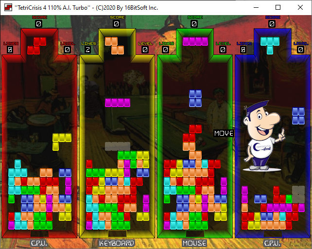 Ein Tetris mit vier Feldern, von denen die beiden Äußeren Ihrem PC (C.P.U.) vorbehalten sind. Die zwei anderen bedienen die Spieler mit der Tastatur (Keyboard) bzw. der Maus (Mouse). Letzterer muss zum Start im Mouse-Spielfeld auf "Join in" klicken. Die Computer-Gegner können Sie deaktivieren, wenn Sie in den Optionen "CPU Players" auf "Off" stellen. Das Spielprinzip von Tetris ist hinlänglich bekannt - das Ziel ist es, eine Reihe vollständig mit Steinen zu füllen, nur dann leert sie sich und Ihr Punktestand wird erhöht.