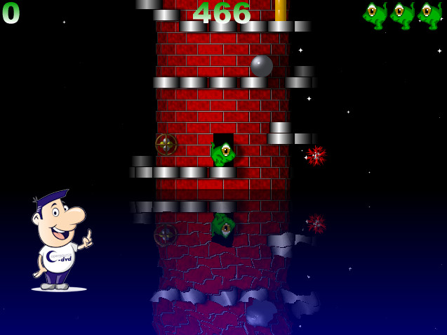 In diesem netten Jump'n-Run-Spiel versuchen Sie als grünes Tierchen, Türme zu besteigen. Schon der erste macht Probleme, denn die Kreaturen, die darin leben, wollen ihn natürlich vertreiben. Seine einzige Waffe besteht darin, mit Schneebällen (Leertaste) auf sie zu werfen. Doch leider reagieren die meisten der unfreundlichen Gegner nicht darauf. Dann heißt es, irgendwie auszuweichen. So klettert er höher und höher, Stufe für Stufe, durch Türen in den Turm hinein, ein Stockwerk höher wieder heraus. Doch einer der größten Feinde ist die Zeit.
