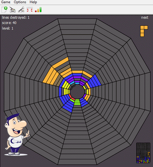 Ein Tetris aus einem ungewöhnlichem Blickwinkel spielen. Herabfallende Blöcke müssen in einen 3-D-Tunnel möglichst passgenau eingefügt werden. Mit den Pfeiltasten beeinflussen Sie den Fall der Blöcke, die Rotation, die Richtung und die Fallgeschwindigkeit.