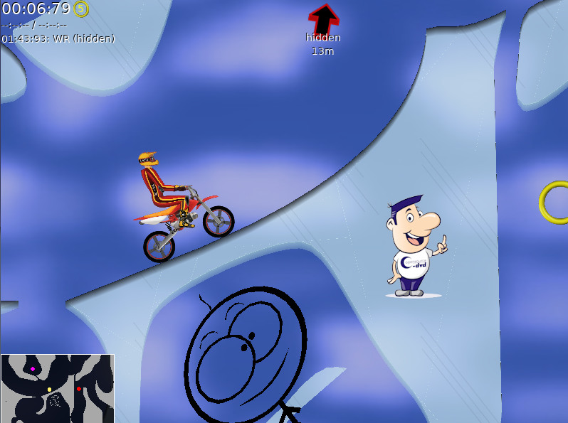 Mit XMoto werden Sie zum Motocrossfahrer, der sich durch unwegsames Gelände lavieren muss. Als ob das nicht schon schwer genug wäre, Sie haben dabei zusätzlich die Aufgabe, alle verstreut liegenden Zahnräder einzusammeln. Achtung: Meiden Sie zerstörerische Objekte, die manchmal auftauchen. Einen Level haben Sie aber erst dann erfolgreich bestanden, wenn Sie unfallfrei die Kugel oder die Blume, das eigentliche Ziel, erreichen. Das Anheben der Räder sowie das Beschleunigen und Abbremsen bewältigen Sie mit den Pfeiltasten.